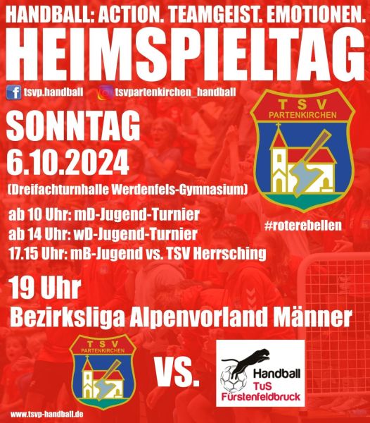Ab 10 Uhr haben wir Handball pur zu bieten. Unsere männliche und weibliche D-Jugend zeigen ihr Können bei Heimturnieren, während unsere männliche B-Jugend als klarer Außenseiter gegen Herrsching antritt.