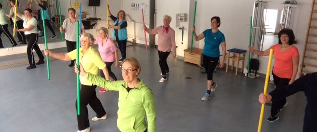 Trainingszeit der Sportgruppe Mittwoch von 17.00 - 18.00 Uhr im Gymnastikraum der Physiotherapie Ebene 0 im Klinikum Garmisch-Partenkirchen, Übungsleiter: Edi Geigl und Julia Schweiger
